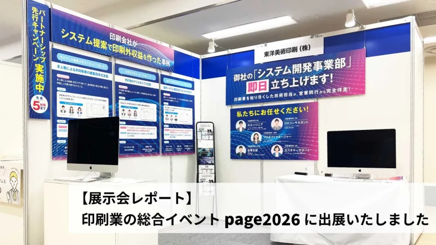 イベント情報【展示会レポート】印刷業の総合イベント page2026に出展いたしました 東洋美術印刷は2026年2月、印刷業界の総合ビジネスイベントである「page2026」に出展、多くの企業・団体の方にお越しいただきました。 page展は1988年以来毎年開催されており、印刷会社・出版社・印刷機メーカーなど印刷に関するあらゆ...2026.03.10イベント情報